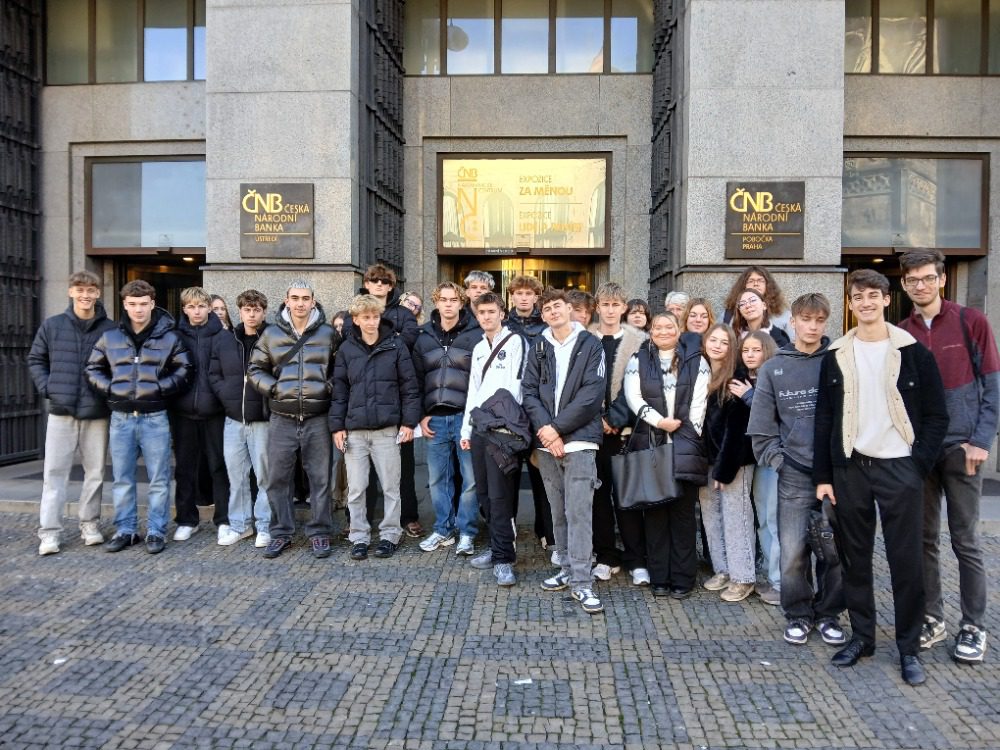 Žáci třídy 3. B se v rámci výuky ekonomiky zúčastnili 7. listopadu 2025 odborné exkurze do České národní banky v Praze. Po příjezdu do budovy ČNB byli studenti přivítáni průvodkyní z oddělení komunikace, která představila historii a hlavní činnosti České národní banky.