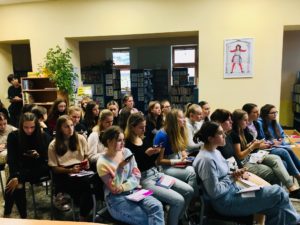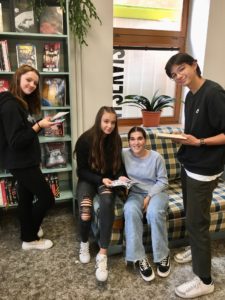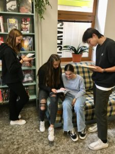 Od paní profesorky E. Zapletalové jsme dostali předem vytištěné otázky, které se týkaly obsahu exkurze. Ve skupinkách jsme si navzájem pomáhali a paní knihovnice nám odpověděly na vše, pro co jsme hledali řešení. Nakonec jsme byli „podrobeni“ anonymnímu dotazníku v podobě ankety. Anketní otázky se týkaly především toho, jak vnímáme knihovnu jako celek. Odpovědi byly různorodé, nejčastěji zaznělo : klid, knihy, ticho, místo, kde si mohu vypůjčit knihu, ale také nuda, nic moc a wifi.